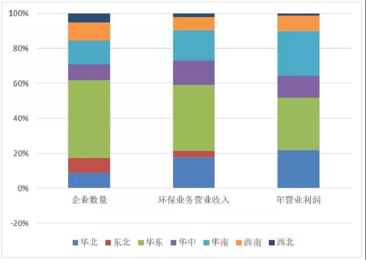 統(tǒng)計范圍內(nèi)有約45%的企業(yè)集聚于華東地區(qū),該地區(qū)貢獻了全國38%的環(huán)保營收,吸納了37%的從業(yè)人員。其次為華南地區(qū),以14%的企業(yè)數(shù)量占比貢獻了18%的環(huán)保營收,吸納了19%的從業(yè)人員。華北、華中、華南地區(qū)人均營業(yè)收入均高于全國平均值(105.2萬元/人)。華東、西南、西北、東北地區(qū)則低于全國平均水平。2020年數(shù)據(jù)顯示,廣東、北京、湖北、浙江、江蘇、山東6 ?。ㄊ校┢髽I(yè)營收總額均超過 1000 億元,6 ?。ㄊ校┉h(huán)保企業(yè)營收總額,占全國的占比超過了 2/3。長江經(jīng)濟帶 11 ?。ㄊ校┮?36.7%的企業(yè)數(shù)量占比貢獻了近一半的產(chǎn)業(yè)營收。