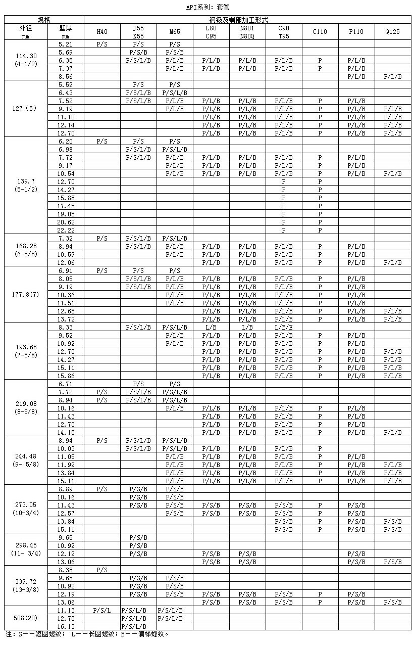 公司為用戶提供全部API SPEC 5CT標(biāo)準(zhǔn)鋼級的油套管,包括:H40、J55、K55、M65、L80、R95、N80 1/Q、C90、T95、C110、P110、Q125鋼級,產(chǎn)品尺寸涵蓋API SPEC 5CT標(biāo)準(zhǔn)全部外徑、壁厚規(guī)格。