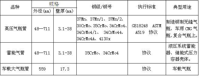 ·高壓氣瓶管: 用于制造鋼制無(wú)縫氣瓶、車(chē)用CNG氣瓶、復(fù)合氣瓶。公司生產(chǎn)的高壓氣瓶管為管制瓶制造提供優(yōu) 質(zhì)的熱軋薄壁無(wú)縫鋼管,具有內(nèi)外表面質(zhì)量好、壁厚均勻、質(zhì)量輕、生產(chǎn)率和成材率高、成本低等優(yōu)點(diǎn),便于無(wú)縫管制瓶瓶底收口的關(guān)鍵技術(shù)的應(yīng)用,使氣瓶管的制 造從采用鋼坯經(jīng)沖孔拉撥轉(zhuǎn)向采用薄壁無(wú)縫鋼管制造,并已成為發(fā)展趨勢(shì),深受用戶歡迎。 ·蓄能器管: 用于液壓系統(tǒng)蓄能器、儲(chǔ)能式壓力容器殼體等。 ·車(chē)載大氣瓶管 用于車(chē)載大口徑氣瓶。 |